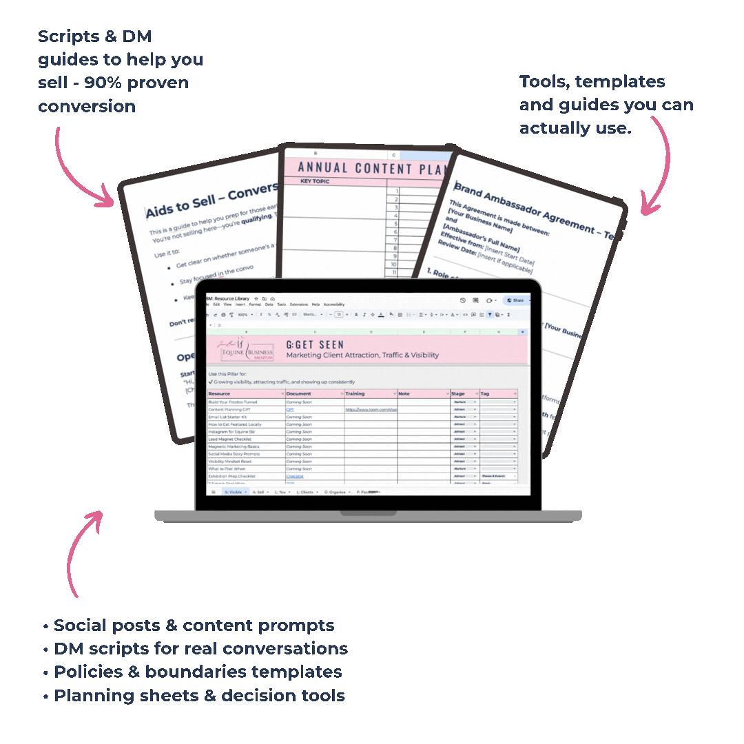 You’ll also get access to my Equine Business Mentor Resource Vault — a practical toolkit I use and update regularly.